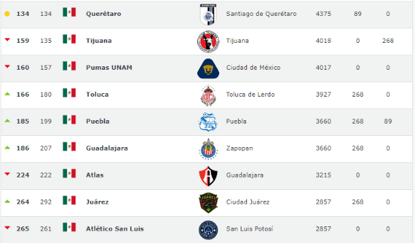 Más atrás aparecen: León (29º), América (40º), Santos Laguna (46º), Cruz Azul (61º), Necaxa (66º), Pachuca (120º), Morelia (125º), Querétaro (134º), Tijuana (159º), Pumas (160º), Toluca (166º), Puebla (185º), Chivas (186º), Atlas (224º), Juárez (264º) y Atlético San Luis (265º).